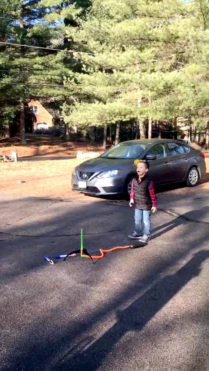 A young girl has a band around her neck and feet but it slips off of her feet and hits her face.