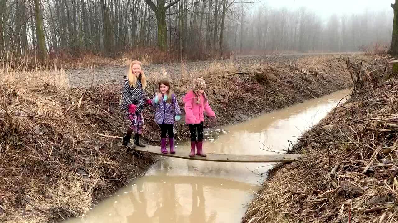 Three young girls bounce on a wooden plank over a creek and the plank breaks and they all fall into the water.