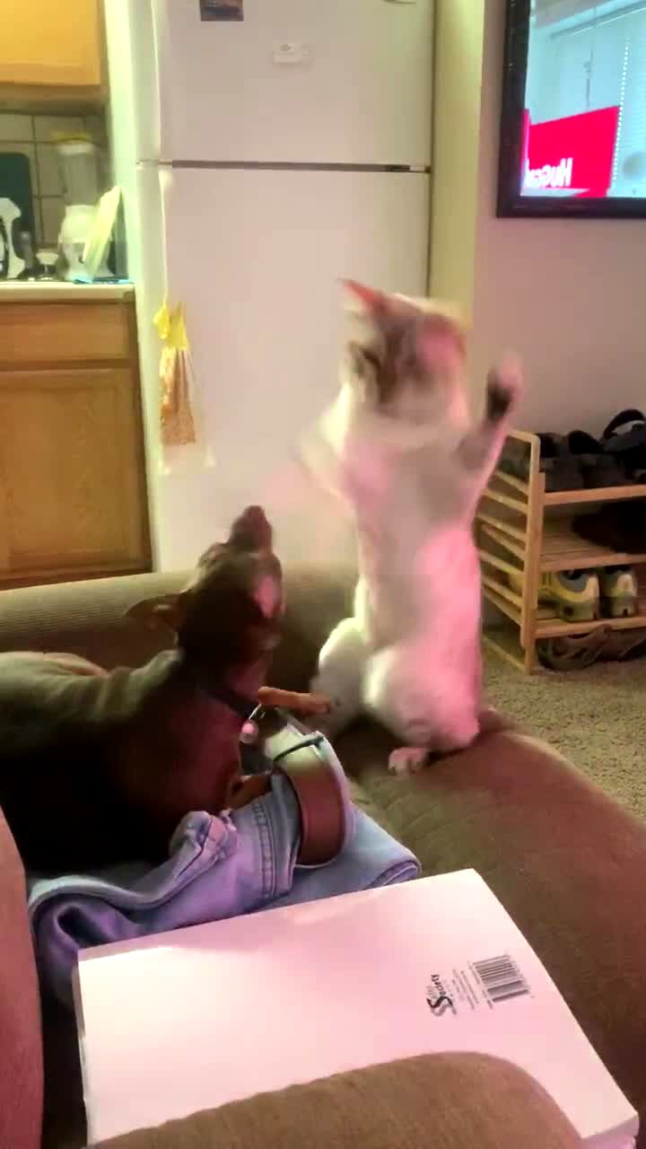 A cat smacks a Pinscher dog on the face and then continues smack even harder with both paws.