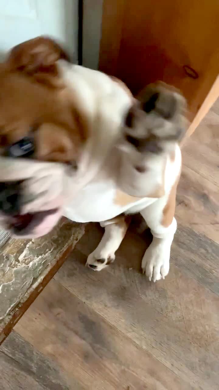 A woman finds her pet Boxer with a ripped up bag of flour in the house. She says "what did you do?" as the dog looks at her and turns its head with a snout full of flour.