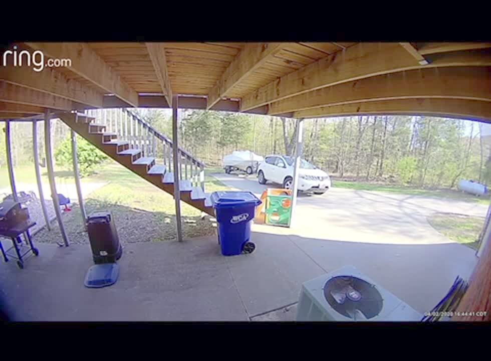 A dog pulls a bundle of bananas off of a kitchen counter. Security footage.