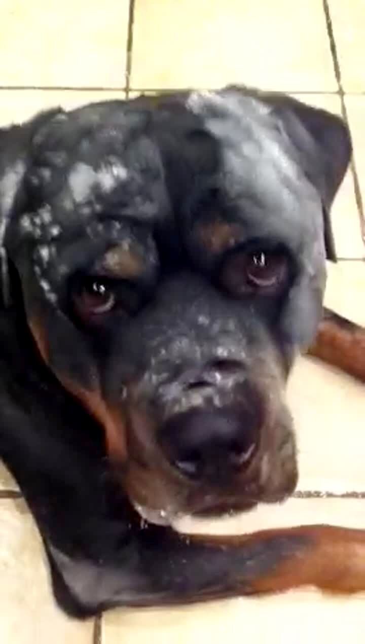 A woman finds a bag of powdered sugar exploded in her kitchen and the sugar on the floor and walls. A Rottweiler lays on the floor with sugar on the dog's head.