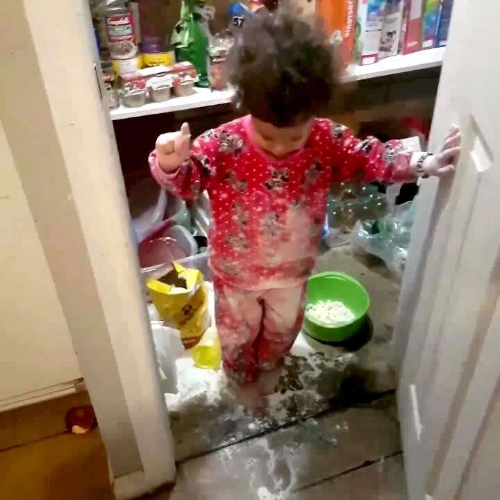 A tot girl gets flour and powder all over the pantry and on her tablet.