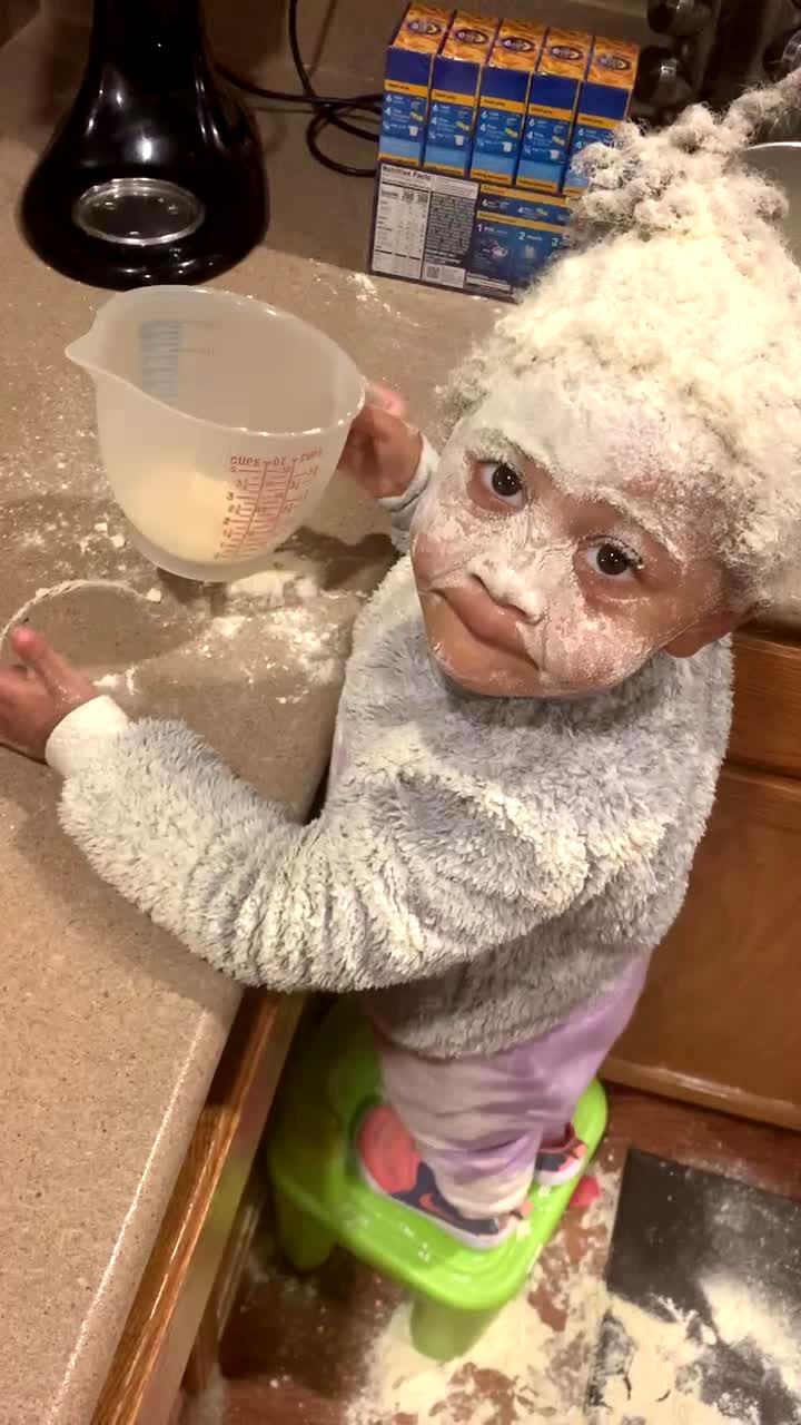 A young girl stands on a stool in the kitchen. She has flour all over her head. Her father asks, "are you making muffins?"