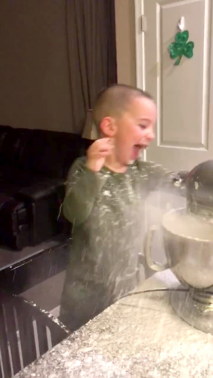 A tot boy turns on an electric mixer in the kitchen and it gets powdered sugar all over him and the counter.