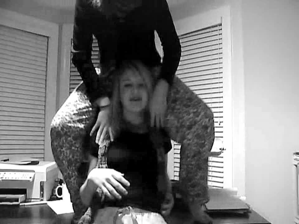 2 teen girls fool around and 1 climbs the other girl's shoulders. They fall over a desk and laugh.