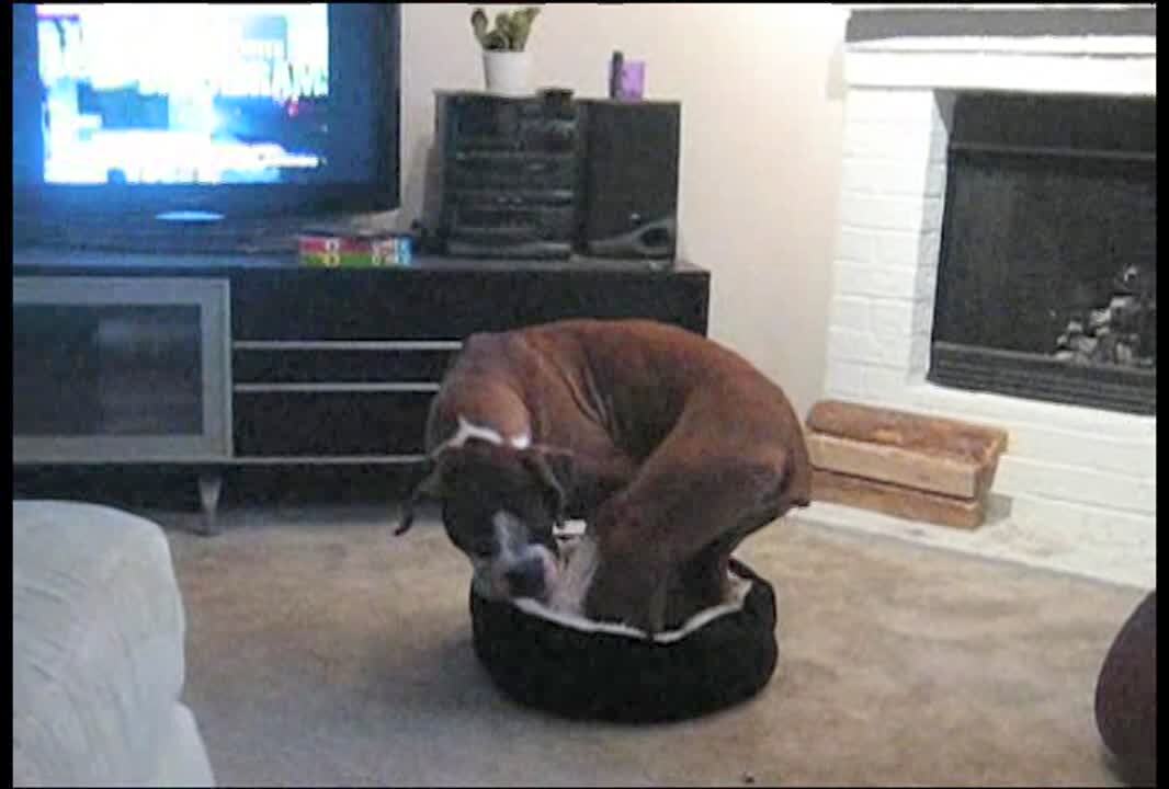 Large boxer dog keeps trying to get comfortable in a tiny doggie bed by circling around in it.