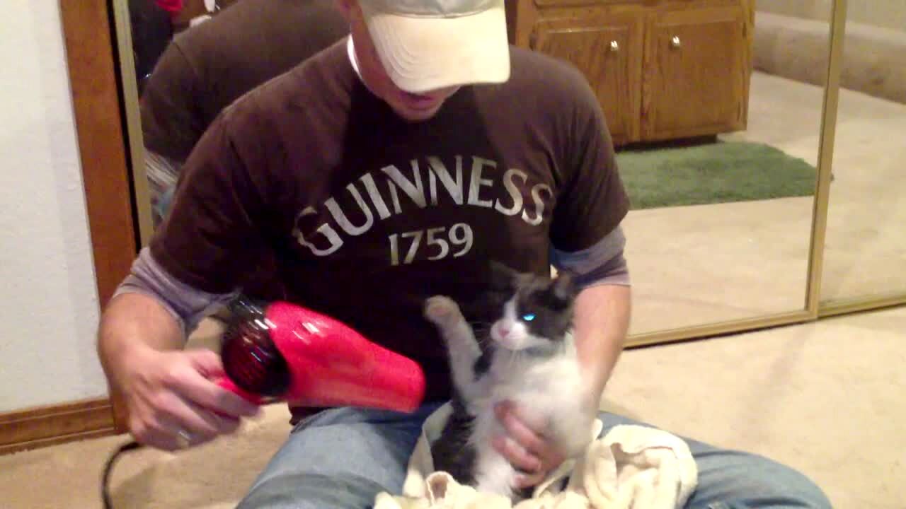 A wet cat swats at a hair drier while man tries to dry it off after a bath. Blow dryer