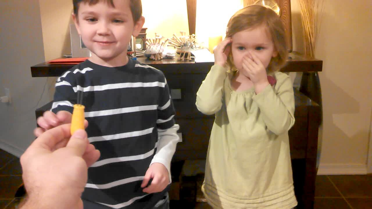 A father holds Hershey Kisses out to his young daughter and asks if she will tell her mother, and the girl says "yes." He tells her that she needs to say "no," and she says "yes" again.