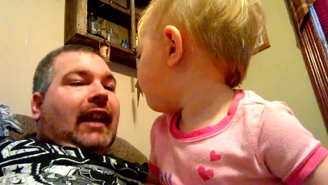 A man films a closeup of a tot girl in the hallway and asks her if she had used any of his hair products. The tot girl responds and the man pulls the camera back to reveal that the tot girl has a long strand of hair that sticks straight up in the center of her head.