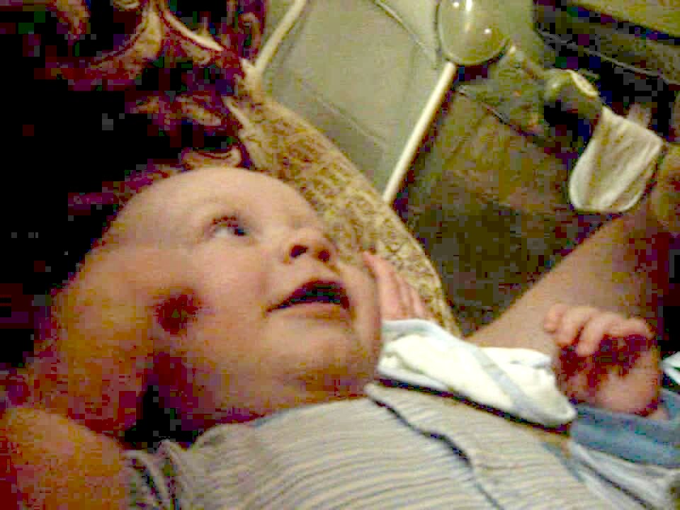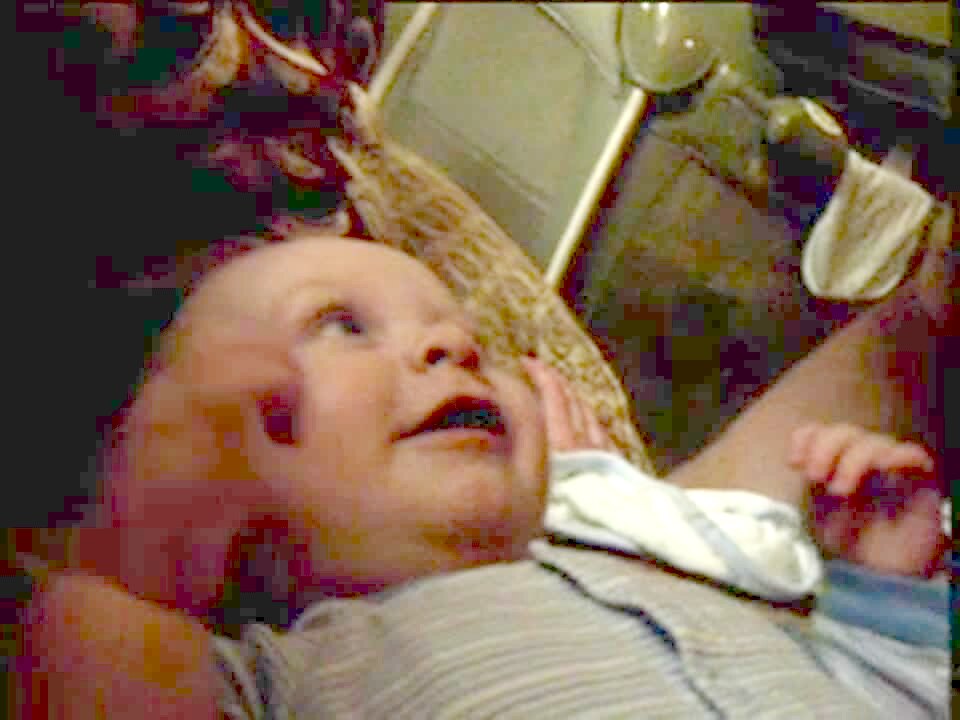 Baby boy says "daddy" after man off camera asks him to "say daddy."