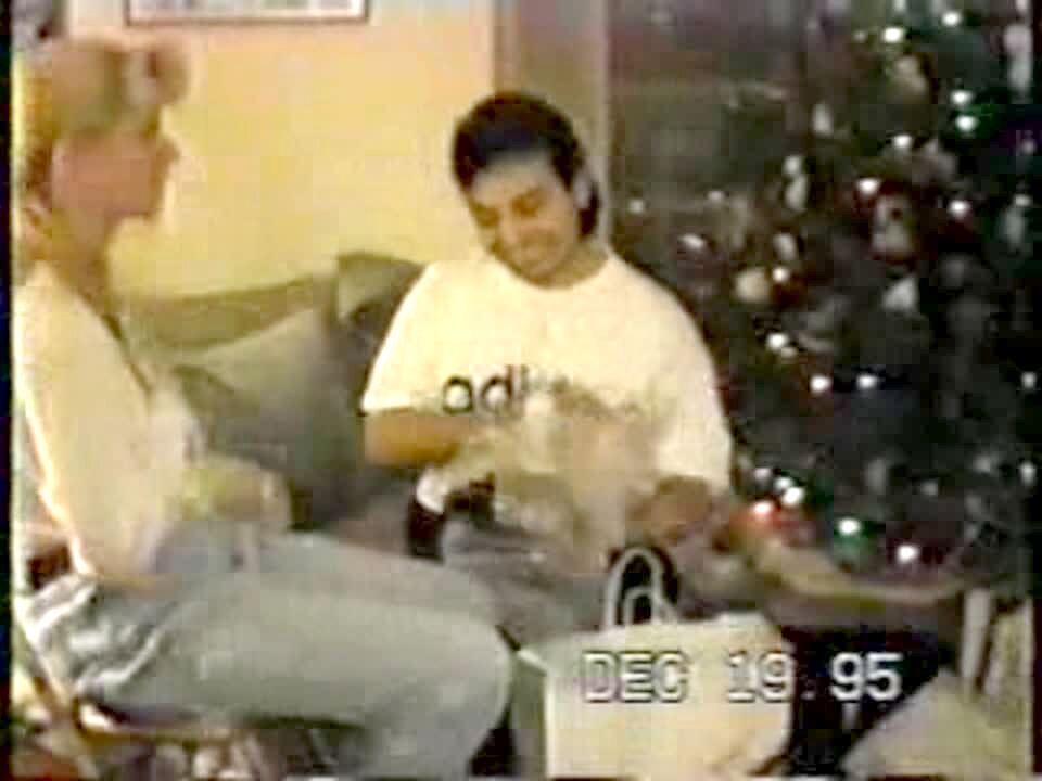A man takes boxes of Christmas ornaments out of a crawlspace while he stands on a ladder, then he falls backwards into the garage.