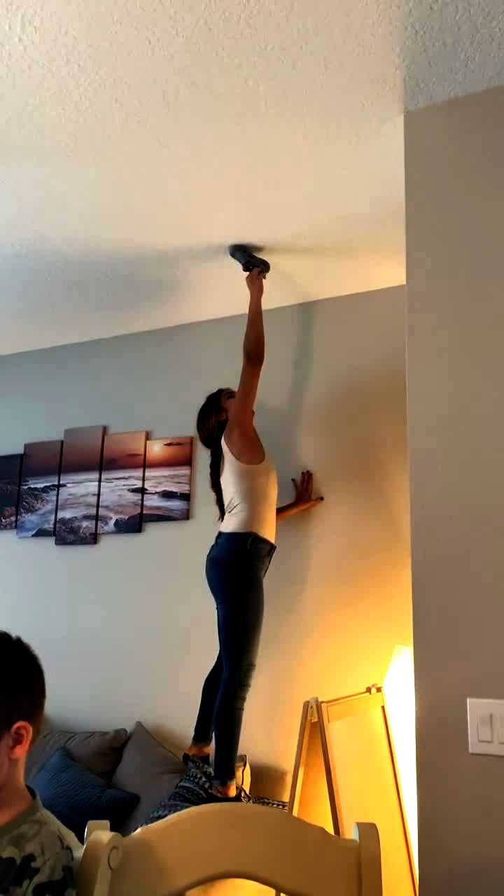 A woman stands on a kitchen counter to scare a young boy when he walks into the room, and she does, but her shorts get stuck on a cabinet door, and it breaks off when she gets down.