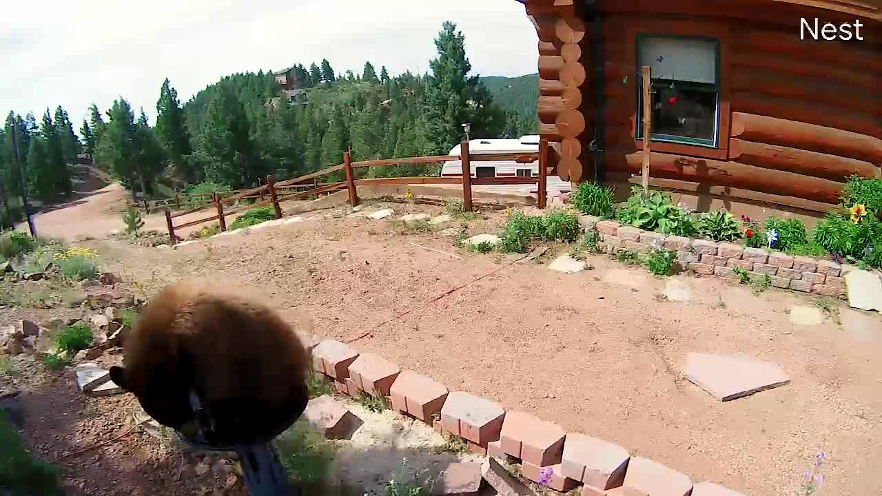 A bear climbs onto a bird bath and sits in the water. It breaks under his weight and he jumps off. Security footage.