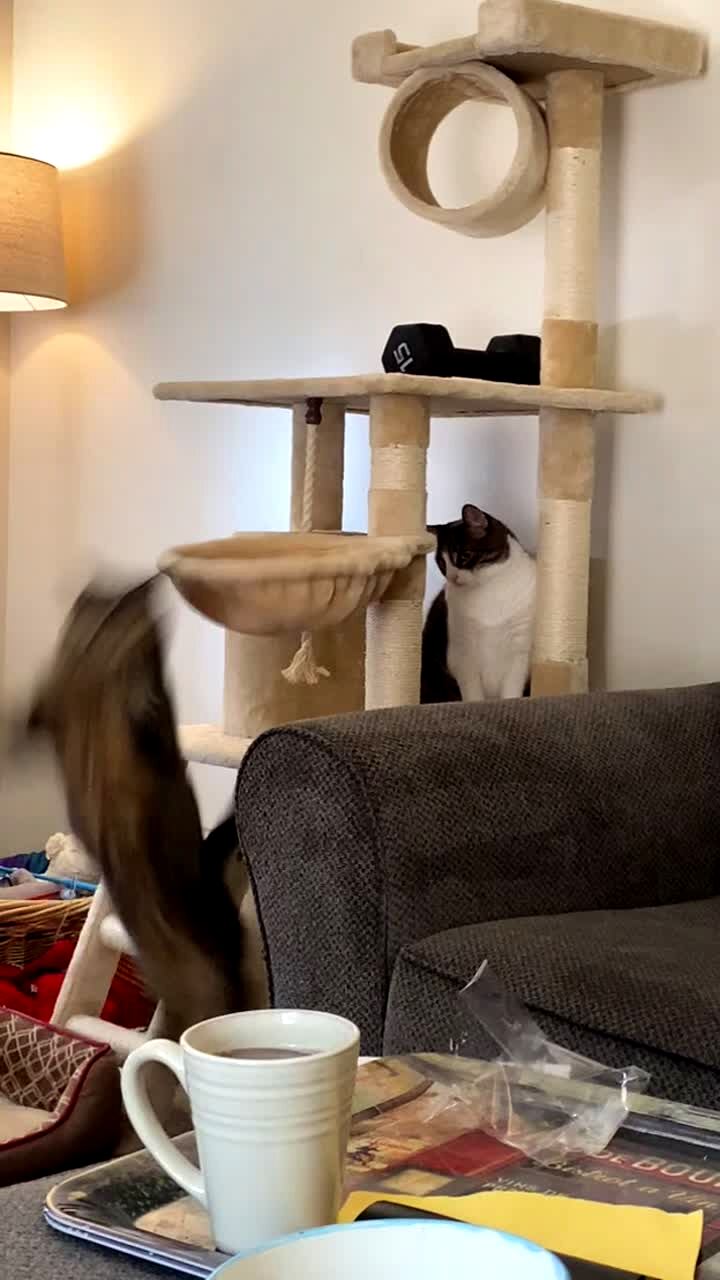 A cat readies herself to jump to the top of a door, but when she jumps, she only makes it halfway.
