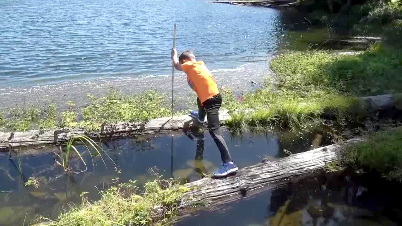 A man sets up the camera at the gym to demonstrate how to lift weights when a young boy walks into the frame, completely obscuring the mans and says "hi."