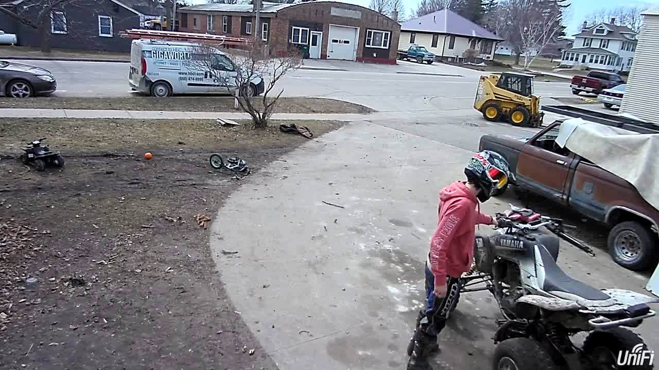 A teen boy gets off of an ATV and it takes off and crashes into a van. Security footage.