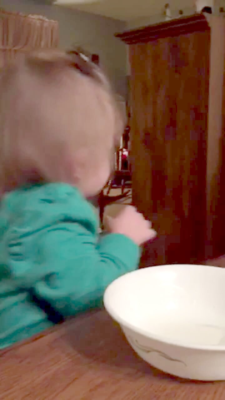 A tot boy turns away from his family at the dinner table and recites the alphabet when his young brother tells him to sing it backwards.