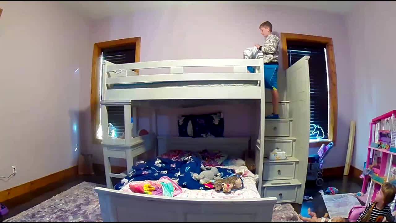 A young boy that makes the bed on top bunk then falls through then younger sister yells at him for being on her bed then after he falls through bed she says he ruined her bed. Security footage.