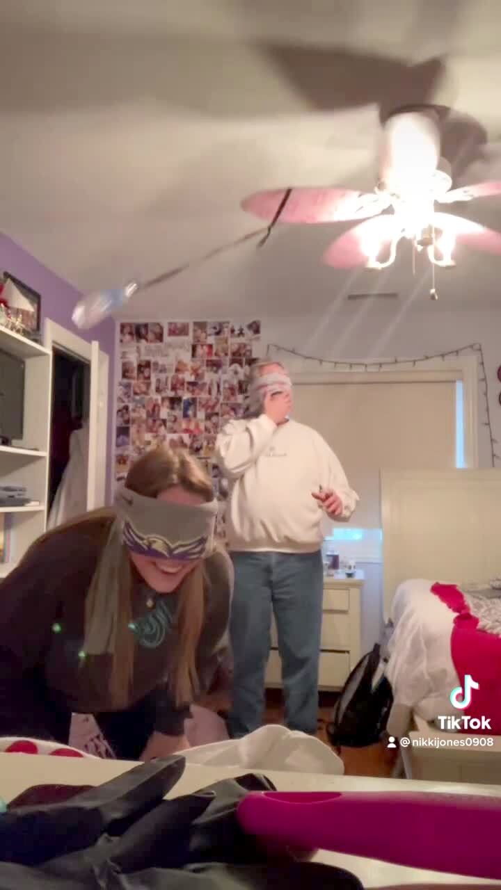 A teen boy in a house ties a water bottle to a ceiling fan as it spins. A senior man and a teen girl are blindfolded and are continuously hit in the head with the water bottle.