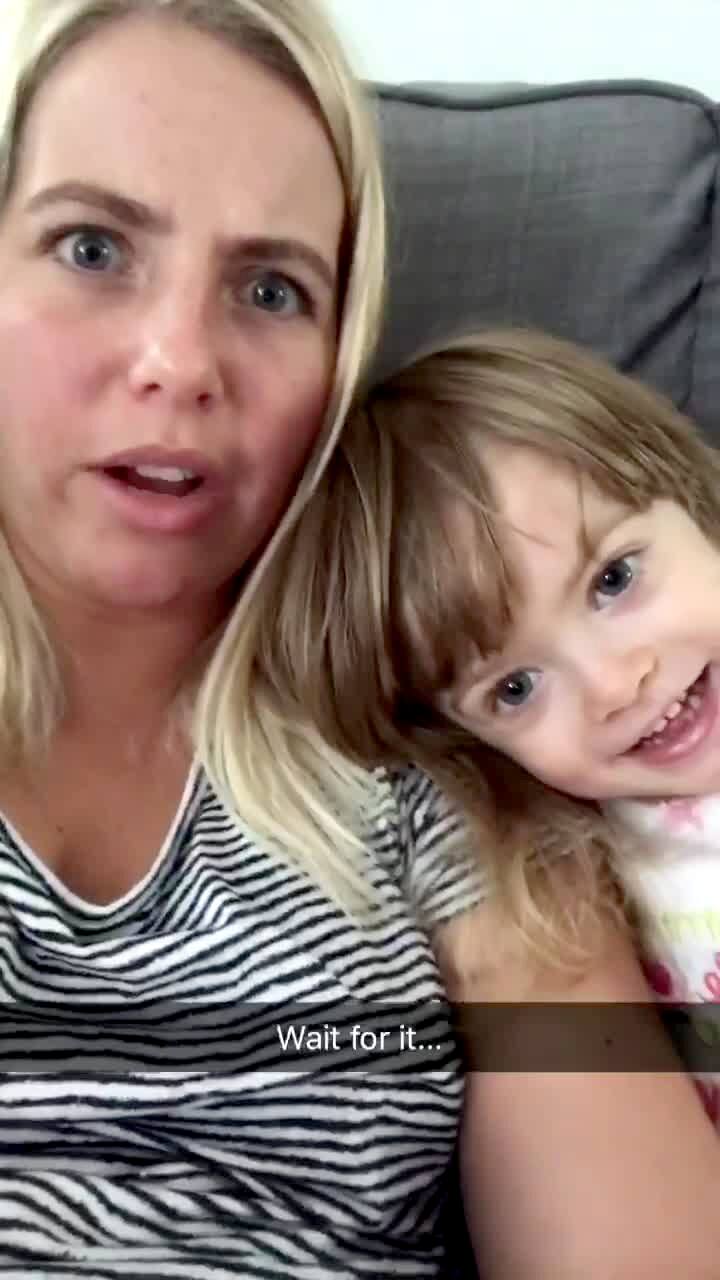 A woman sits on a living room couch with a tot girl. The tot girl headbutts her shoulder over and over. Another tot girl then headbutts her really hard in the face.