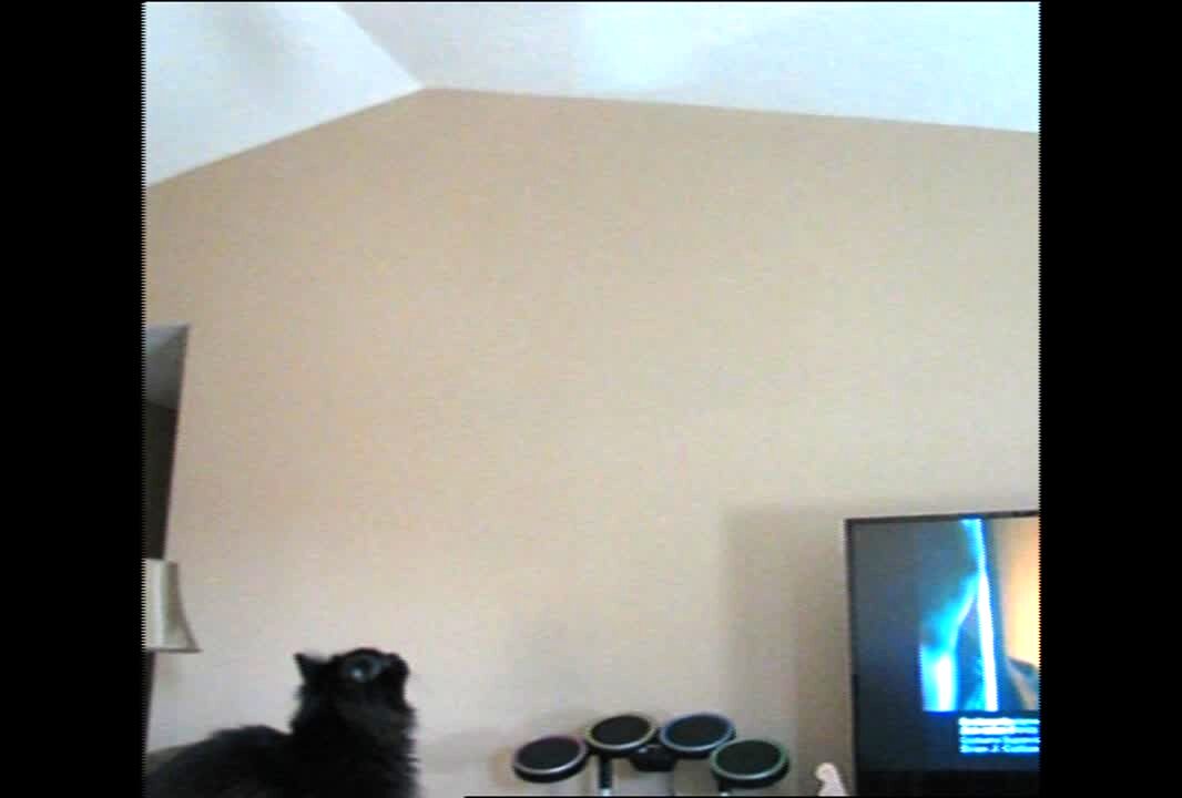A teen girl takes a drink out of the microwave and pours it into another cup, but she and a French bulldog dog both jump when it explodes. Security footage.