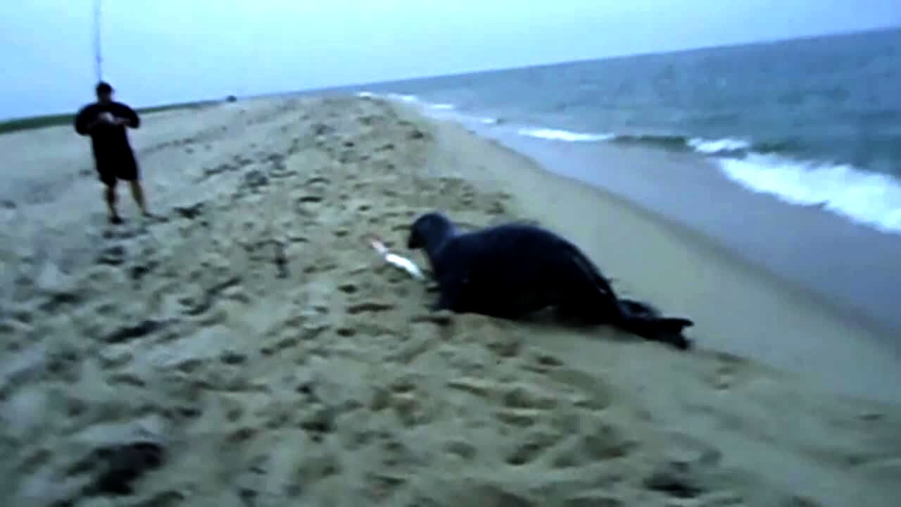 A man struggles to remove a cap on a broken pipe in the basement while another man makes fun of him. He pulls the cap free, then dirty water hits him.