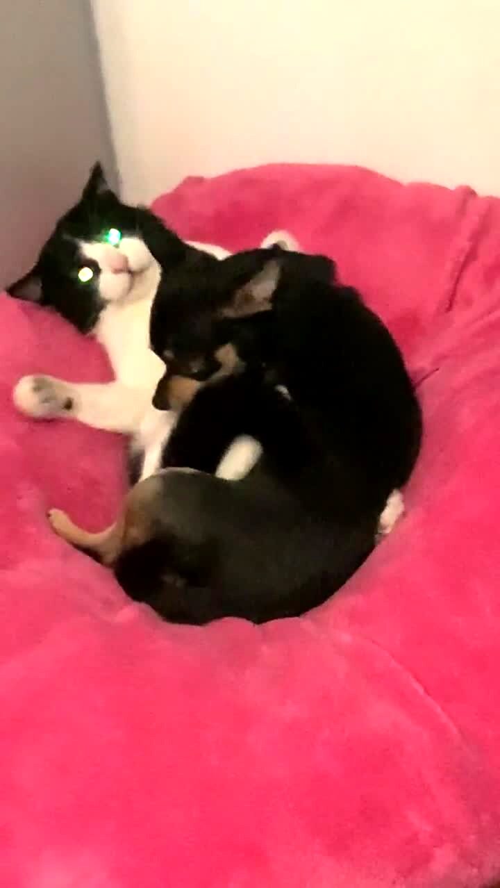 A cat licks a Chihuahua dog as they cuddle in the living room, but then they start to fight.