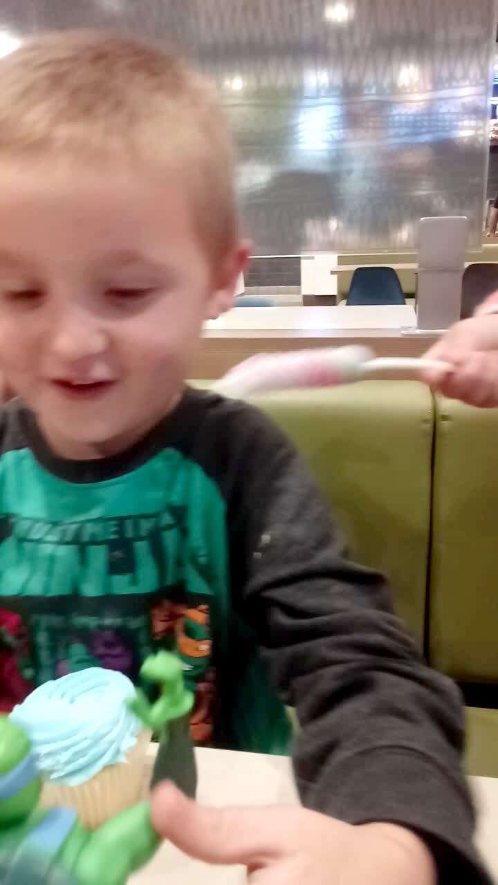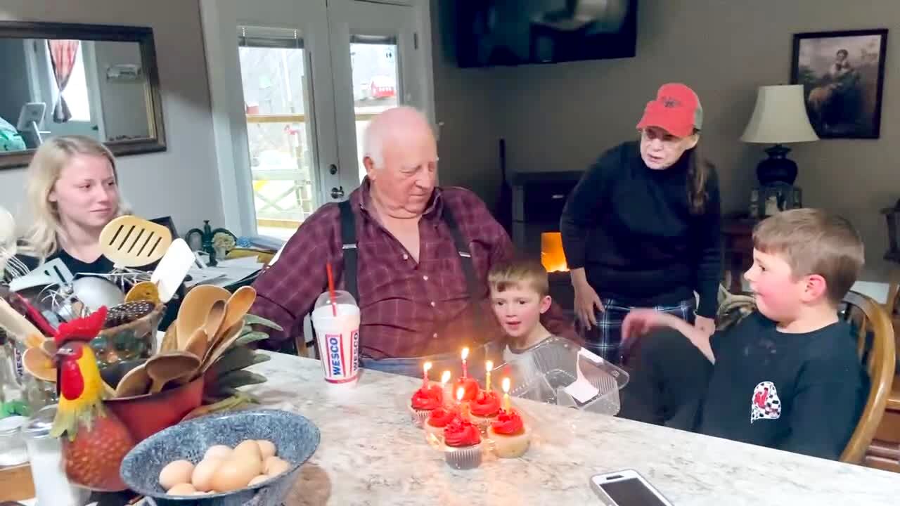 A family sings "Happy Birthday" to a senior man in the house. A man passes the senior a baby boy, and the boy knocks the container of cupcakes off of the table.