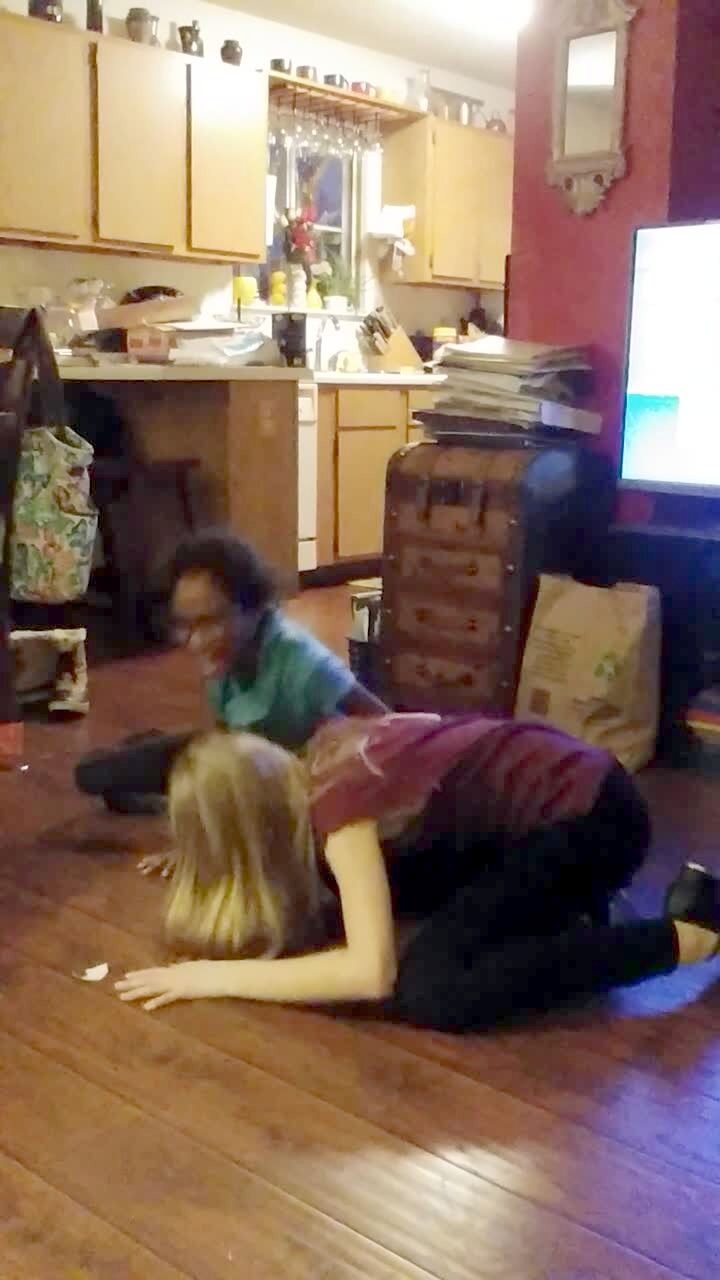 Two young girls slip and fall on hardwood floor while they dance together in tap shoes.