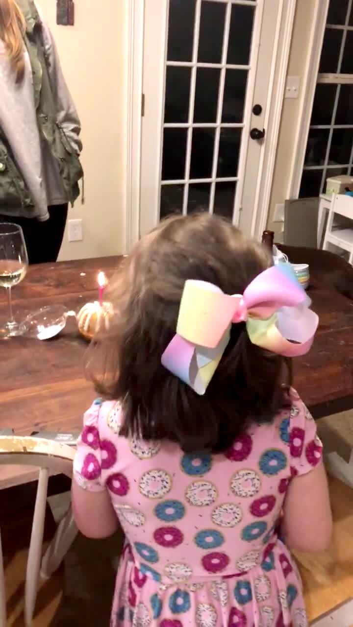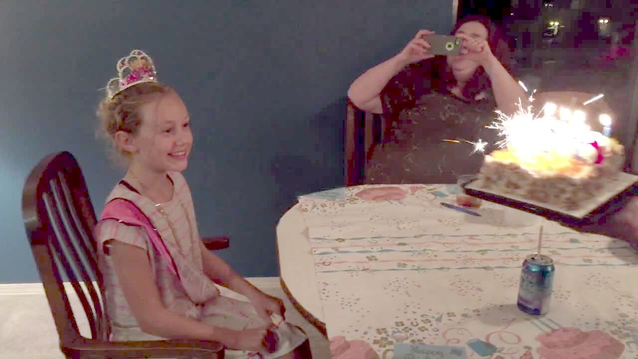 A young girl falls at her birthday party when she leans on a table to blow out the candles on her cake.