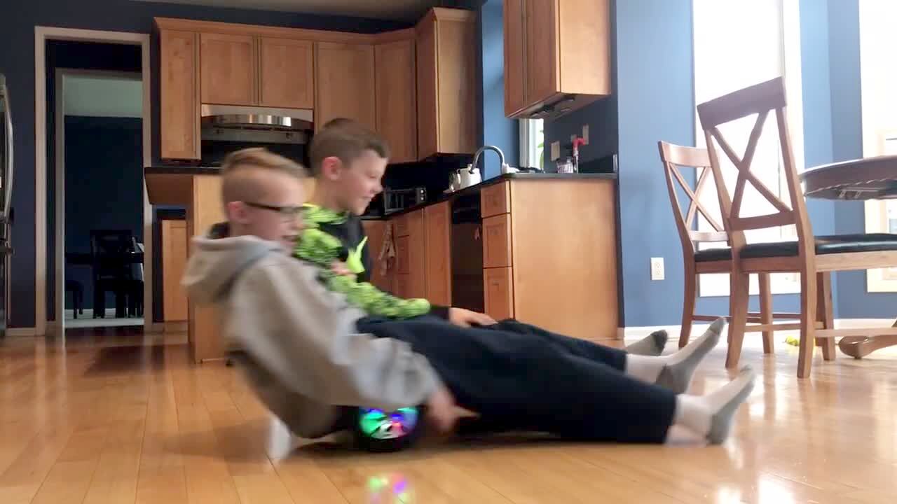 Two young boys sit on a hoverboard and spin around a kitchen until they crash into a garbage can and a dinner chair and fall off.