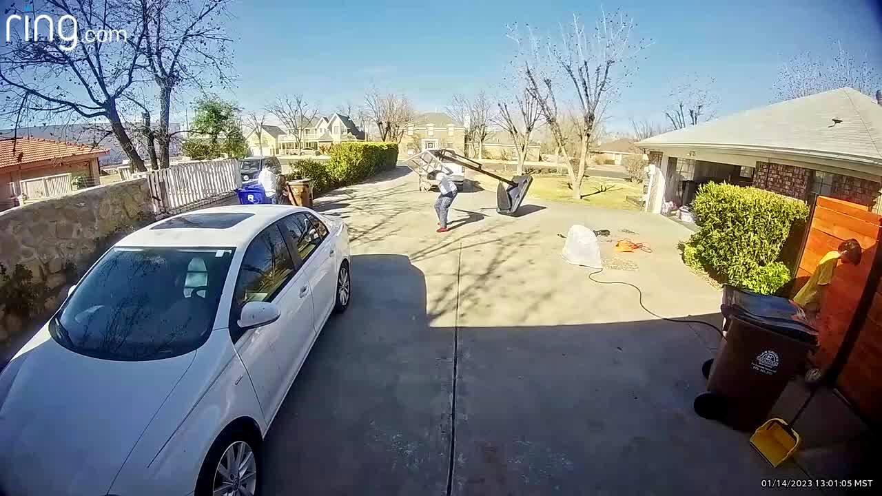 A man jumps and touches the basketball rim in the driveway but then the entire backboard tips over and falls on him. Security footage.