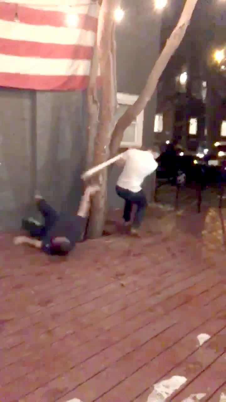 Two men hold a wooden plank and run at a tree in an attempt to break the plank but it doesn't break and it hits one of the men in the face and he falls down. Featured talent cleared only (the two men holding the board).