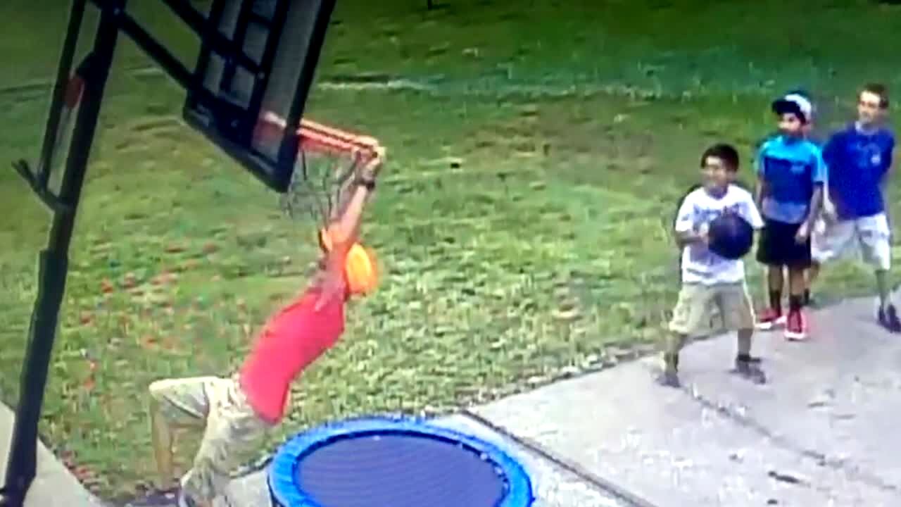 A young girl tells the camera she'll do a back handspring and then sets the camera down on the porch. She goes to the yard and climbs on the trampoline. Right as she does the handspring, a dog walks in front of the camera and blocks her out. The dog walks away and the girl comes back to get the camera.
