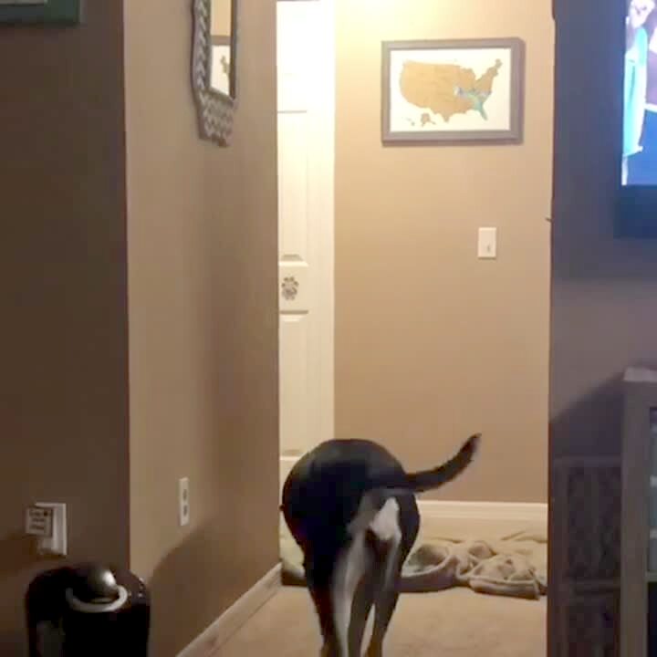 A Labrador dog walks back and forth down a hallway before she looks for a man behind the shower curtain in the bathroom when he disappears behind a blanket and hides when he does the What the Fluff challenge for his two Labrador dogs.