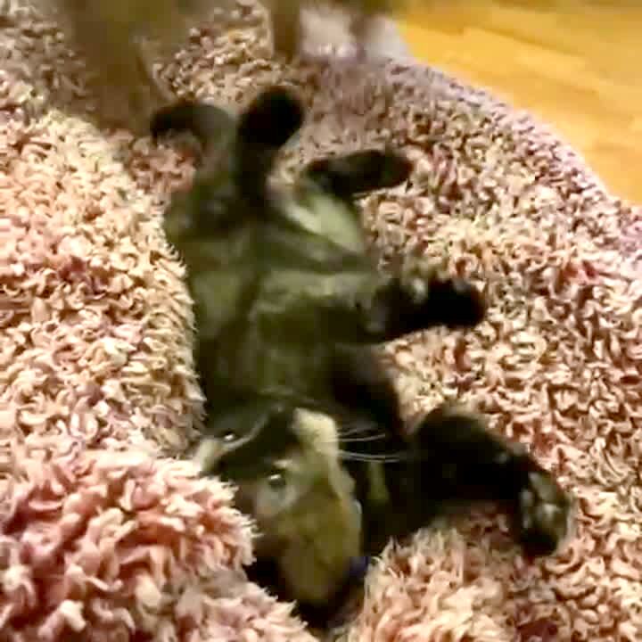 A woman says "bang" and one of her French Bulldog dogs rolls onto its back in the house, then pushes the other dog with its nose to roll over.