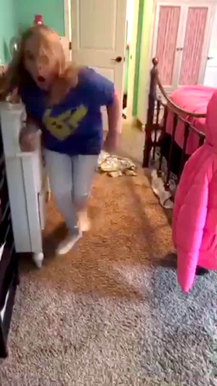 A girl dances in her room, she falls into her dresser and the television falls off.