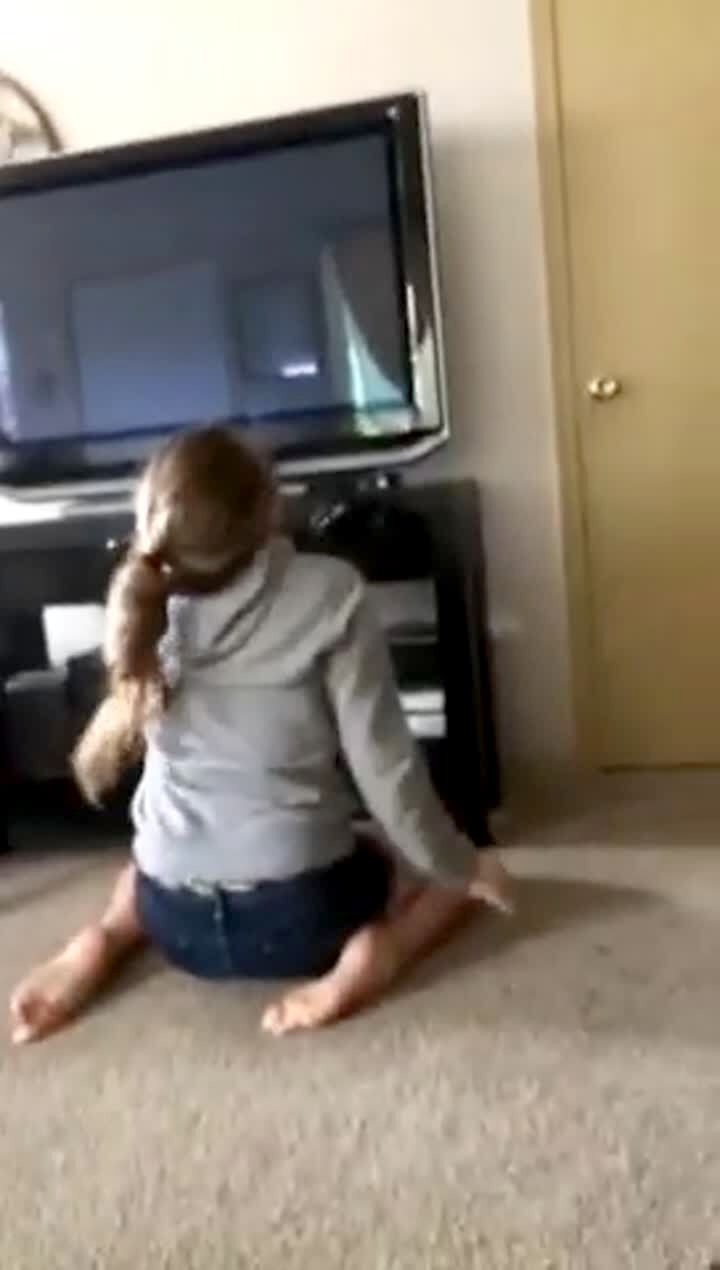 A teen girl tries to do a back bend at home in front of a television and falls forwards, hitting her head on the TV.