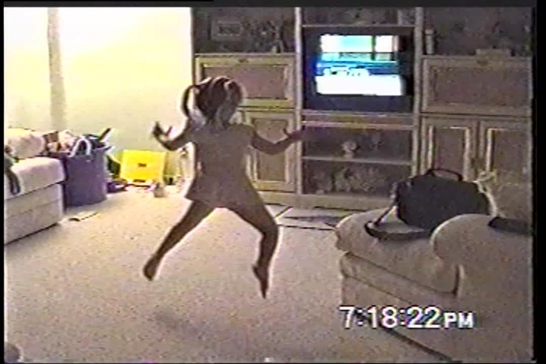Tot girl tries to imitate fitness girls dancing on TV. She does a double somersault right into shelves and breaks them with glass stuff on them. No recovery