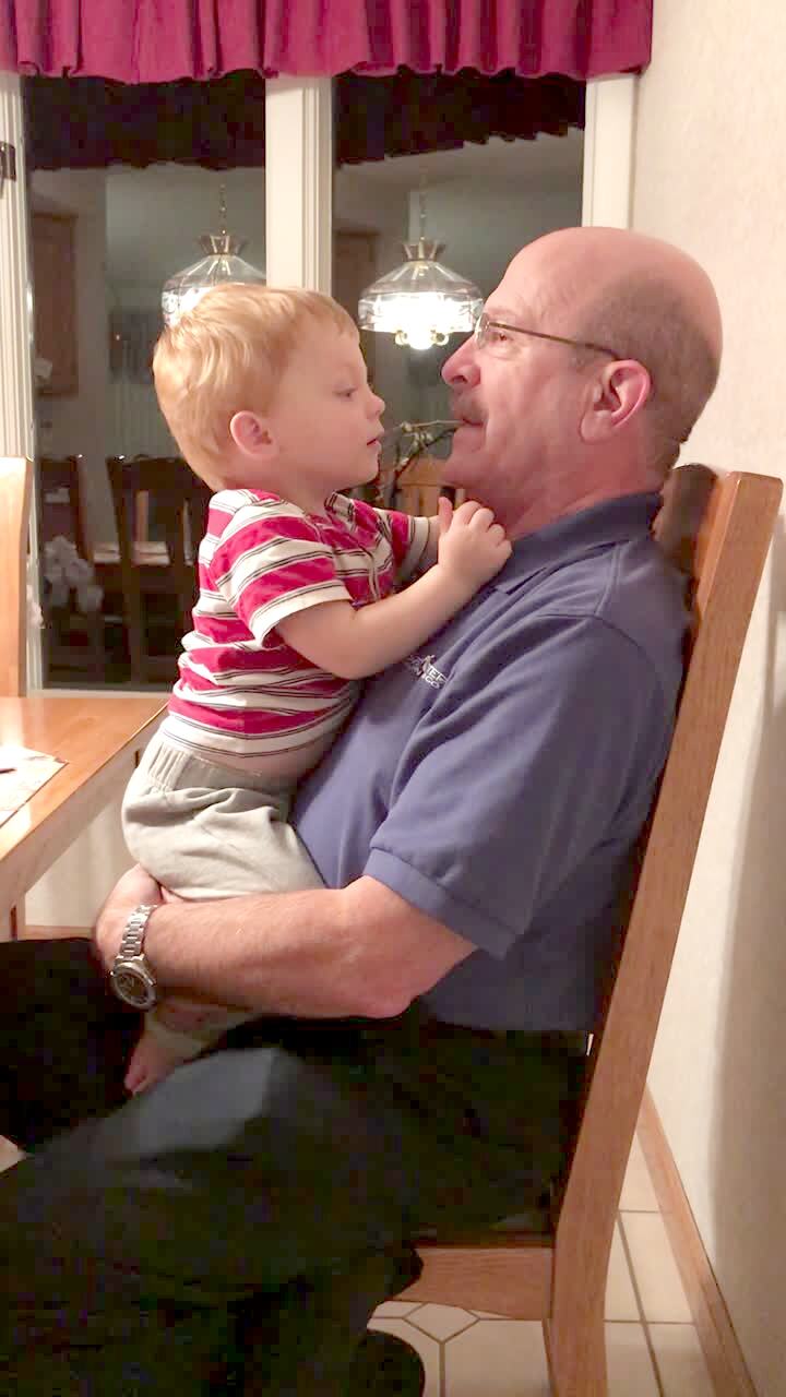 Baby boy plays with Grandpa's face while he's held in the kitchen & laughs. Senior man says "don't throw up on me" then baby spits up on him. Gross, puke, vomit. Short tails.