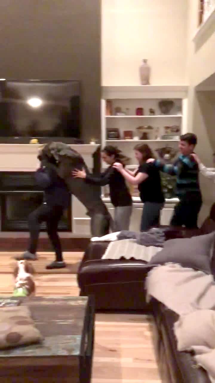 2 teen girls throw another girl into the air to do a cheerleading trick inside the house. They drop her next to a home gym set. Boneheads.