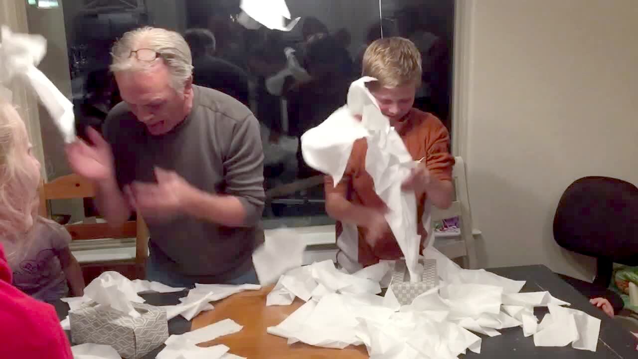 Man spins a chandelier hanging over the dining room table at a party. The chandelier light comes crashing down.