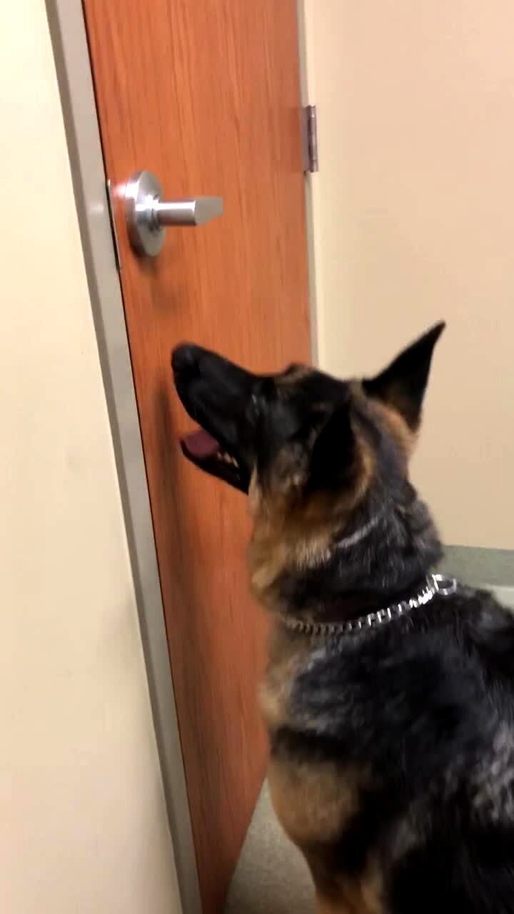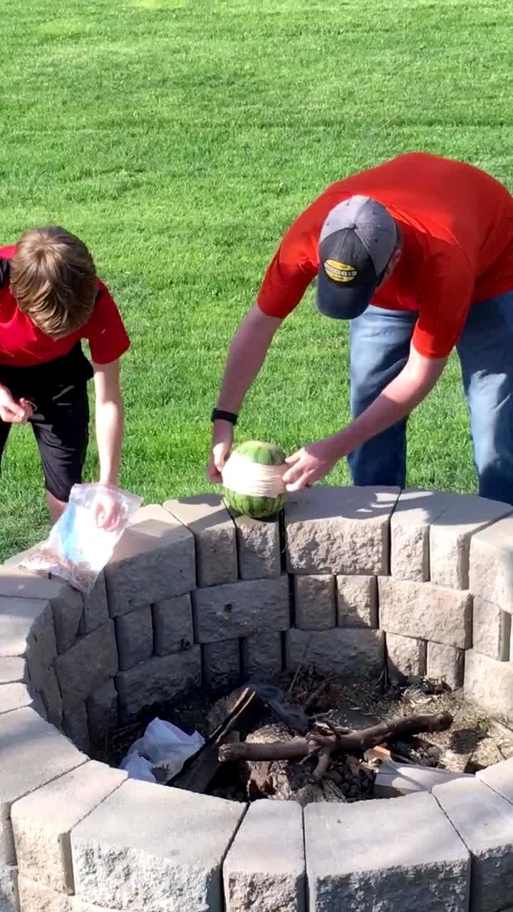 A man sprays a fire extinguisher and runs into a garage door outdoors.