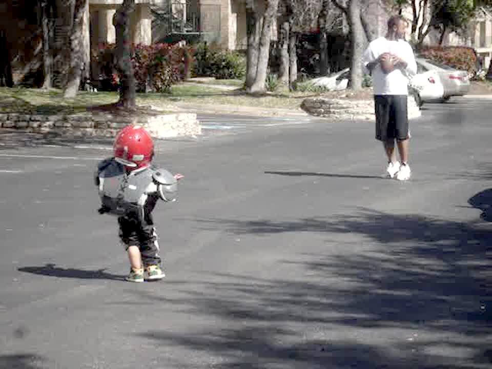In a parking lot a man throws a football at a tot boy wearing oversized football pads. Ball hits boy on the head (helmet), boy falls down onto pavement.