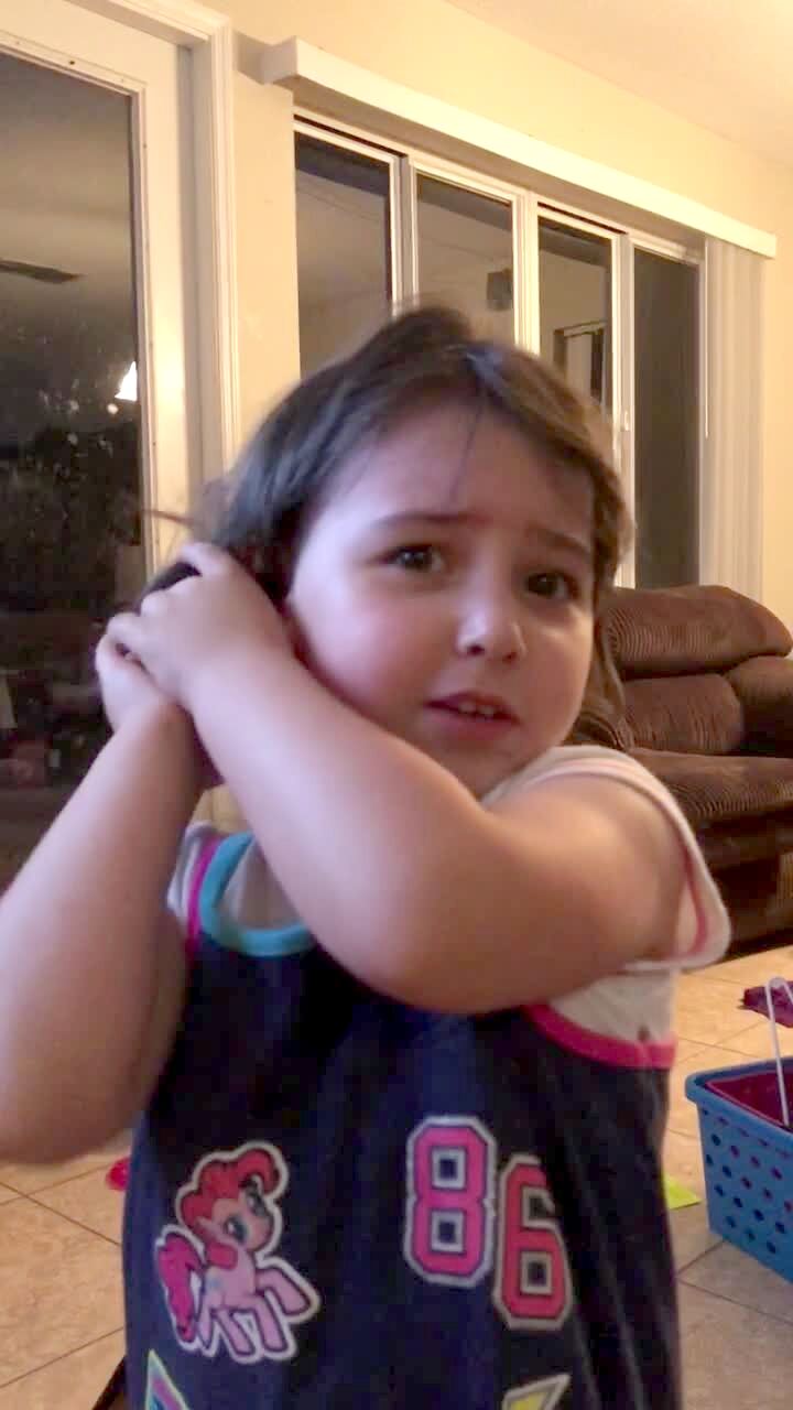 A tot girl shows her mom her hair that she has cut and a lot of it is missing. The woman exclaims, "Sweet baby Jesus" and the girl answers, "I know, right?!"