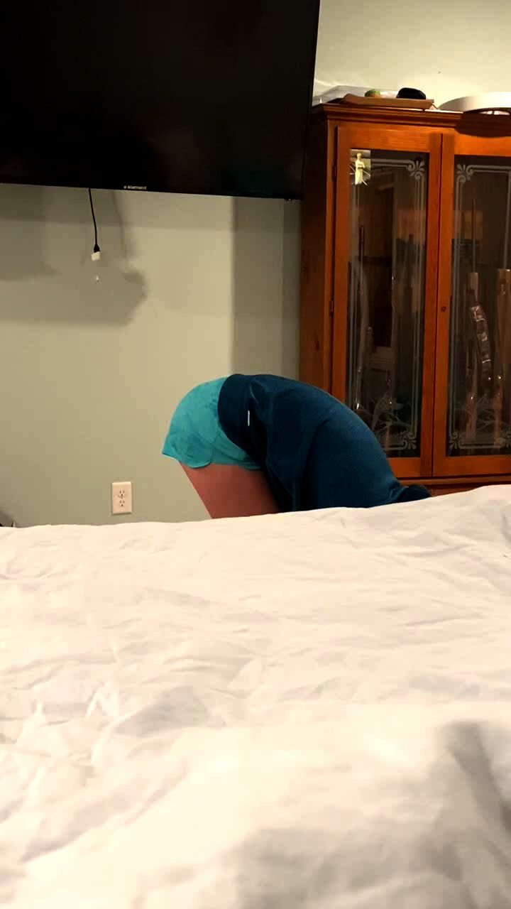 A teen girl bends over to put pants on, and then she says she is stuck. Her parents walk over to find her, and her head is caught in her pants leg.