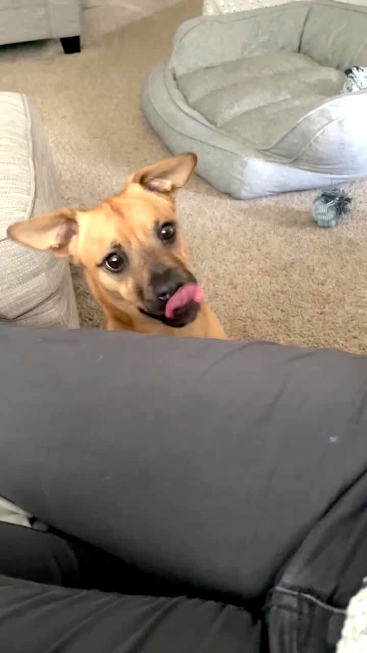 A woman pretends to feed her dog treats and the dog bites out of her empty hand in the living room