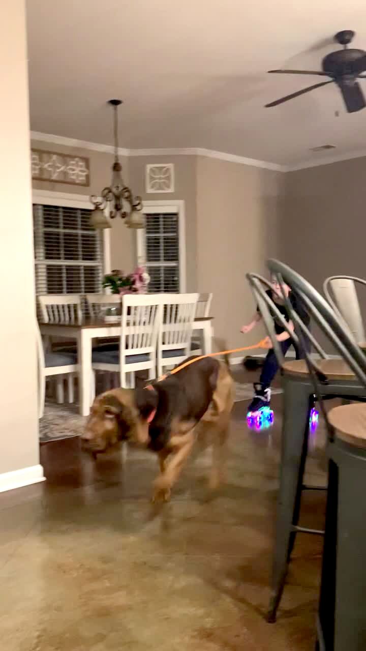 A young boy throws a ball across a room. A big dog runs after the ball while the boy hold's the dog's leash. The boy wears roller blades and the dog pulls him across the floor and the boy falls.