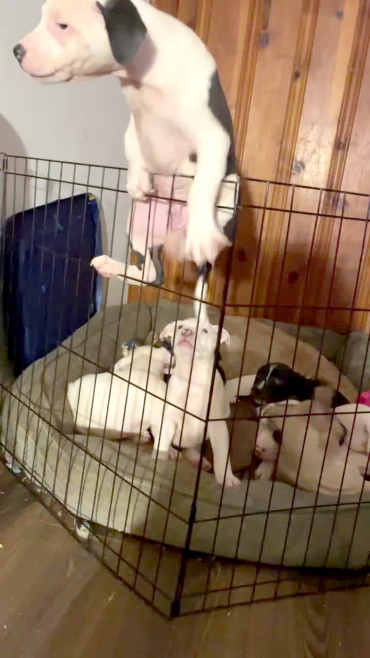 Dogs squeal and whine as they sit behind a gate when climbs up, topples and flips over to the other side.